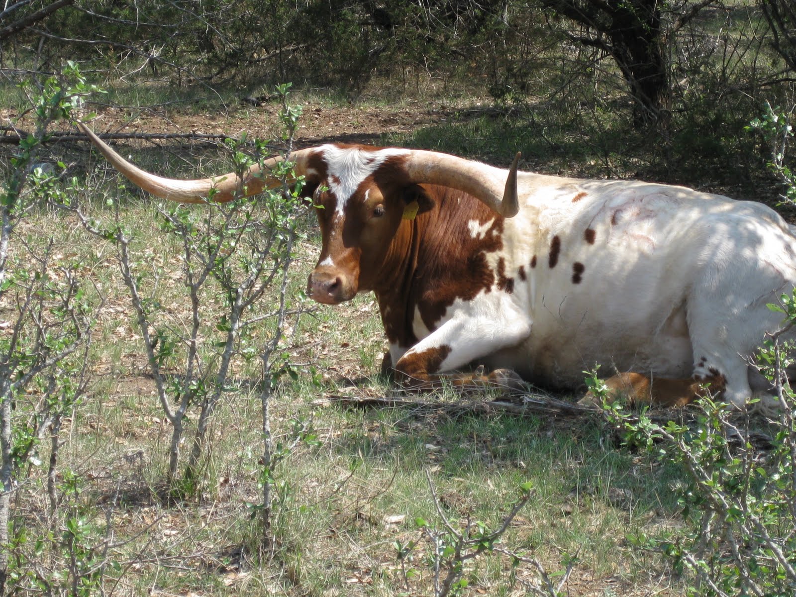 Texas Longhorn rests in behind barbed wire as seen along the road on a trip from Llano to Colorado Bend State Park. The Spanish brought these magnificent creatures to the new world, and they survive mainly as pets.